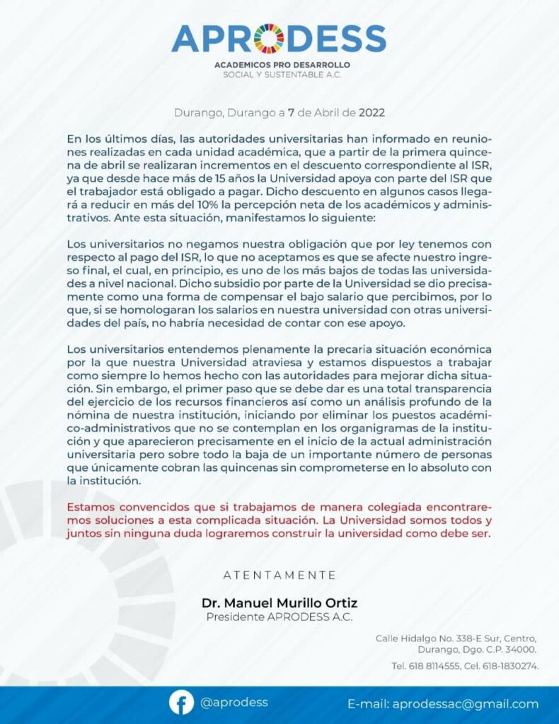 Académicos se pronuncian en contra que, a partir de la primera quincena de abril se realizarán incrementos en el descuento correspondiente al Impuesto Sobre la Renta (ISR), ya que, desde hace más de 15 años, la Universidad apoya con parte del ISR que el trabajador está obligado a pagar.
