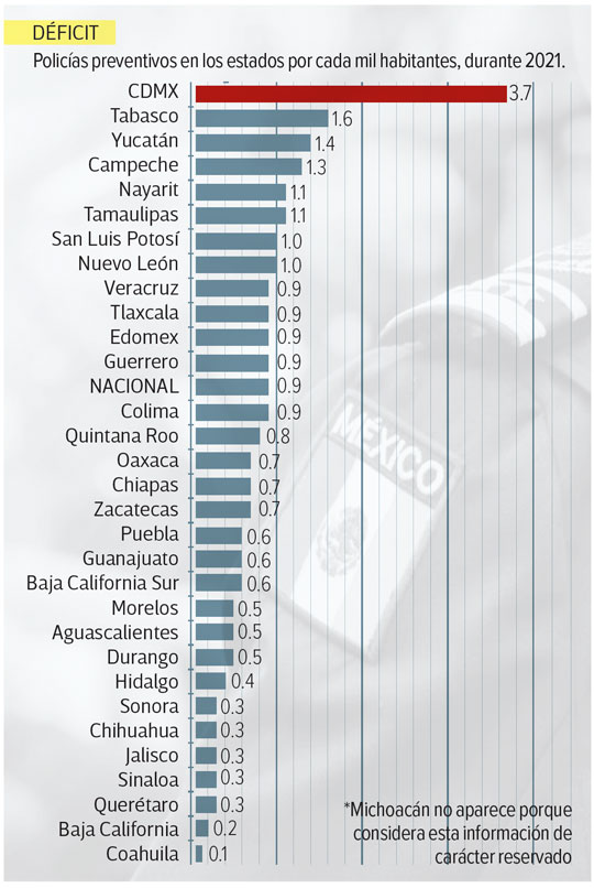 De acuerdo con el Censo Nacional de Seguridad Pública Estatal (CNSPE) 2022, elaborado por el Inegi, al cierre del año pasado la tasa nacional promedio fue de 0.9 agentes preventivos por cada mil habitantes. La más alta corresponde a la CDMX, con 3.7, seguida por Tabasco, con 1.6. La tasa más baja la registra Coahuila, con 0.1 uniformados.