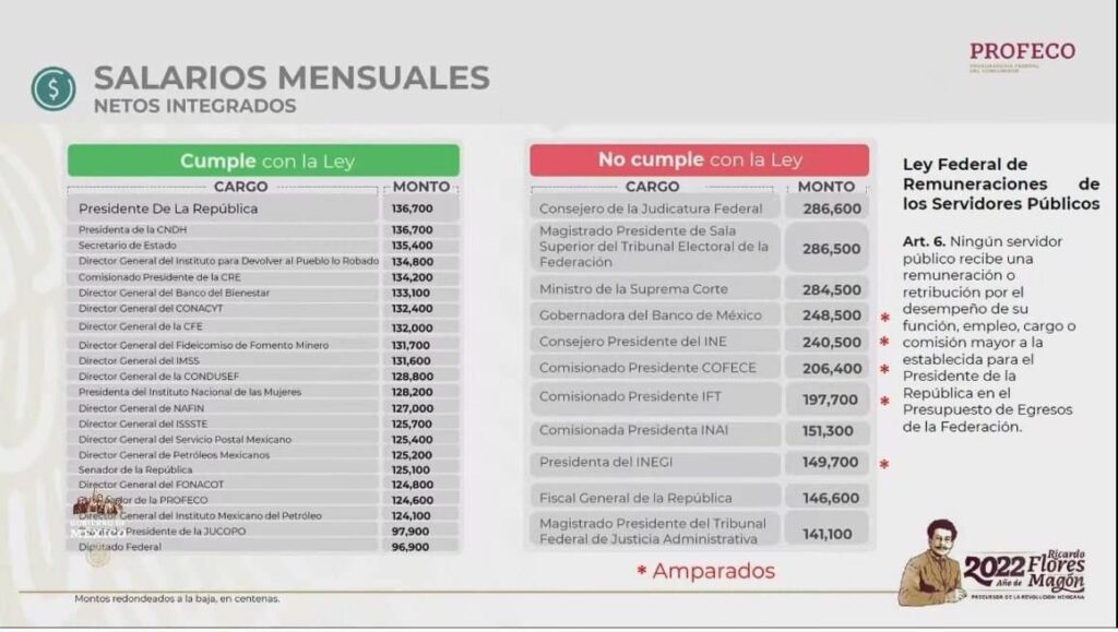 Ciudad de México.- Amparados o violando la Ley Federal de Remuneraciones de los Servidores Públicos, al menos 11 funcionarios de la administración pública tienen un sueldo superior a los 136,700 pesos mensuales que recibe el presidente Andrés Manuel López Obrador, se dio a conocer este lunes en la rueda de prensa «mañanera».